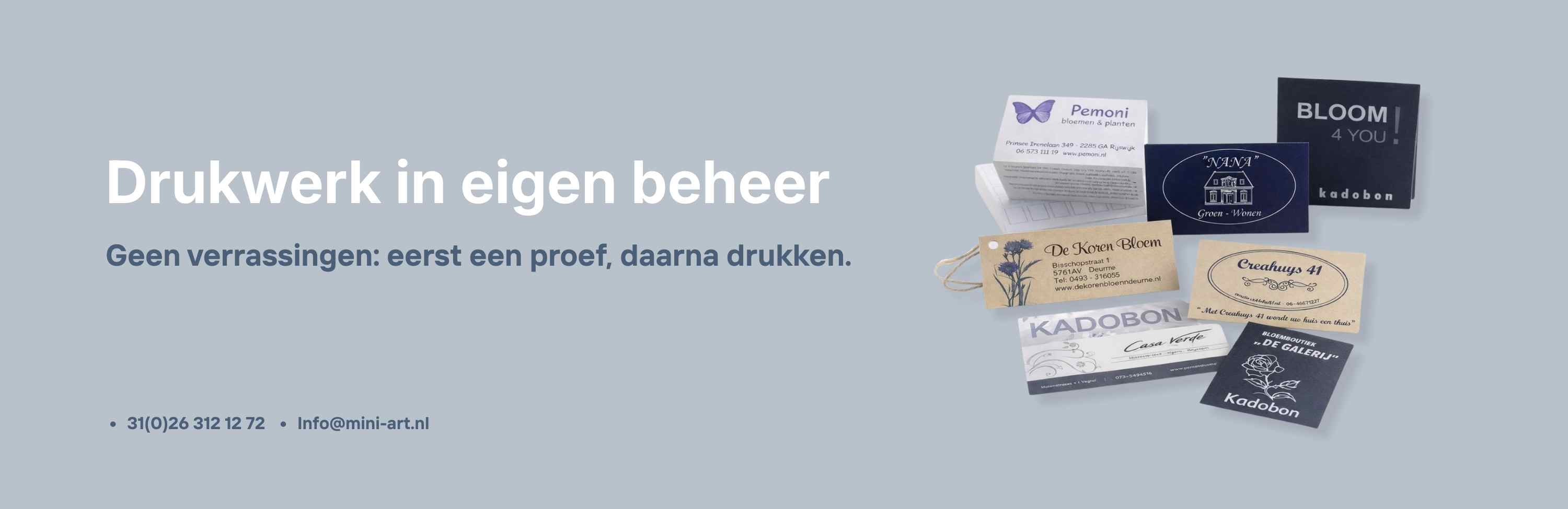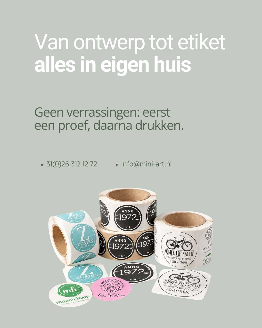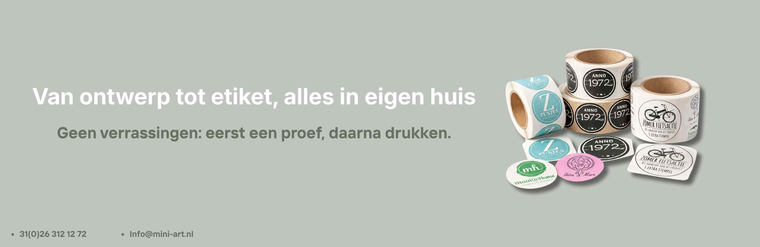 Kortom, Mini-Art is totaal leverancier als het gaat om etiketten drukken, naamkaarten en naamlinten en drukwerk. En mocht je een speciale vraag hebben? Bel ons gerust even.