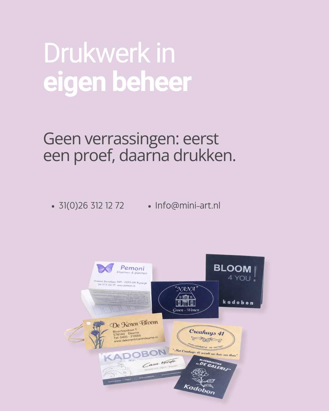 Onze kracht bij Mini-Art is dat we snel en goed jouw wensen weten te vertalen in een mooi ontwerp en product. Zo kun je bijvoorbeeld een cadeaubon, sticker of spaarkaart geheel naar eigen wens samenstellen. We zorgen voor ontwerp en productie, waardoor je een goede kwaliteit kunt verwachten.