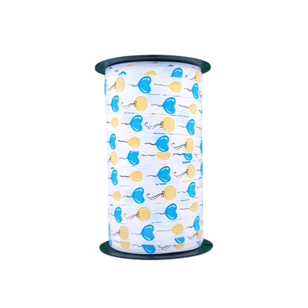 Celebrate life in style with this cheerful curling ribbon measuring 10mm wide and 50 meters long. The white ribbon is printed with a playful print of blue and yellow balloons, making it perfect for festive occasions.