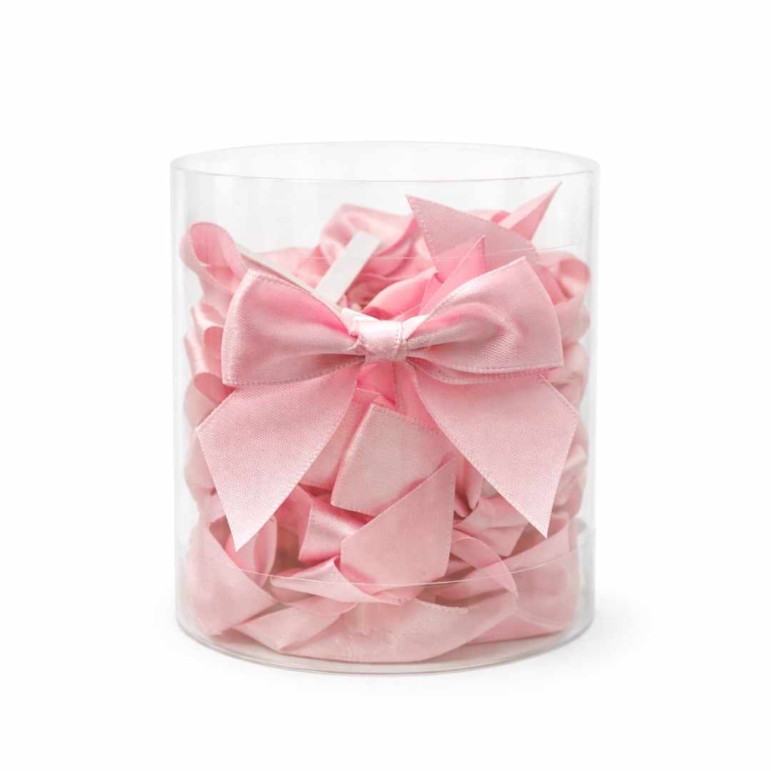 This set consists of satin bows in a light pink shade with a soft, even textile sheen. The satin has a supple weave structure and is therefore easy to process on substrates such as cardboard, paper, foil and light fabrics. The bows are pre-shaped and equipped with a narrow fastening strip, so that they can be applied directly and without additional aids. The version does not fray during normal use and is suitable for storage in dry warehouse conditions.
