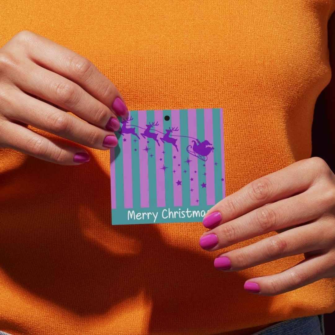 Maak je kerstcadeaus extra vrolijk met deze speelse cadeaukaartjes met de tekst “Merry Christmas”. Perfect om een persoonlijke boodschap toe te voegen aan je geschenken tijdens de feestdagen. De kaartjes zijn gemaakt van stevig karton en hebben een boorgaatje, zodat je ze eenvoudig kunt bevestigen aan een lint, strik of cadeautasje. Het moderne ontwerp met een paarse kerstman in slee, rendieren en sterren op een gestreepte achtergrond zorgt voor een eigentijdse, feestelijke uitstraling.