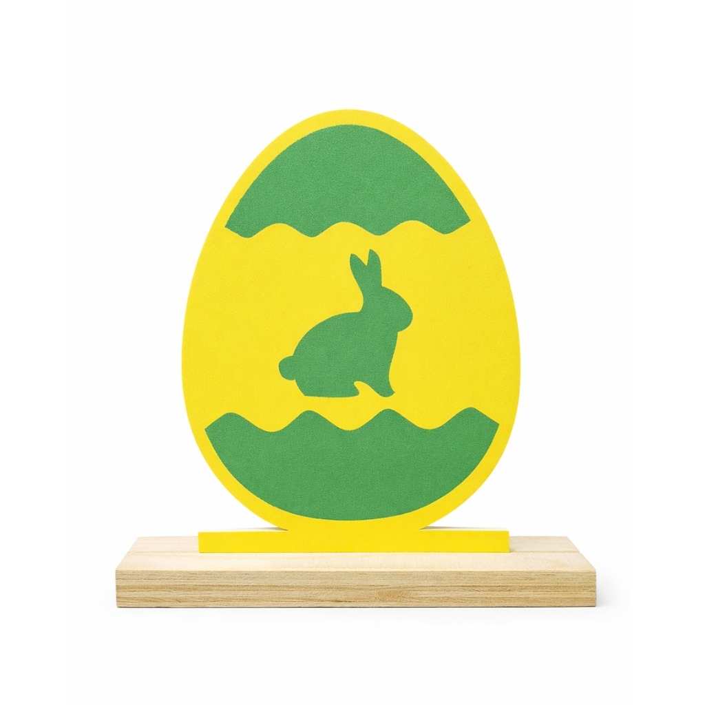 Dit decoratieve paasei is een vrolijke en sfeervolle toevoeging aan je paasdecoratie. Het ontwerp in frisse geel- en groentinten met een silhouet van een konijntje geeft direct een lenteachtige uitstraling. Dankzij de speelse vorm en contrasterende kleuren trekt het decoratieplaatje meteen de aandacht en brengt het een gezellige paassfeer in huis.