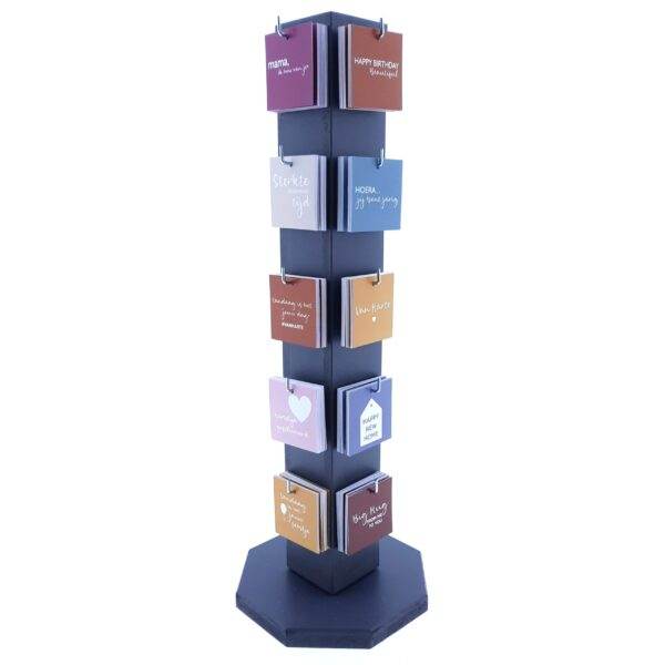 De display bevat 400 cadeaukaartjes, overzichtelijk verdeeld over 20 haken. De kaartjes zijn uitgevoerd in diverse zachte en frisse kleuren en voorzien van korte Engelstalige teksten, gedrukt in metallic goud. Dit geeft elk kaartje een verfijnde en luxe uitstraling die direct de aandacht trekt.