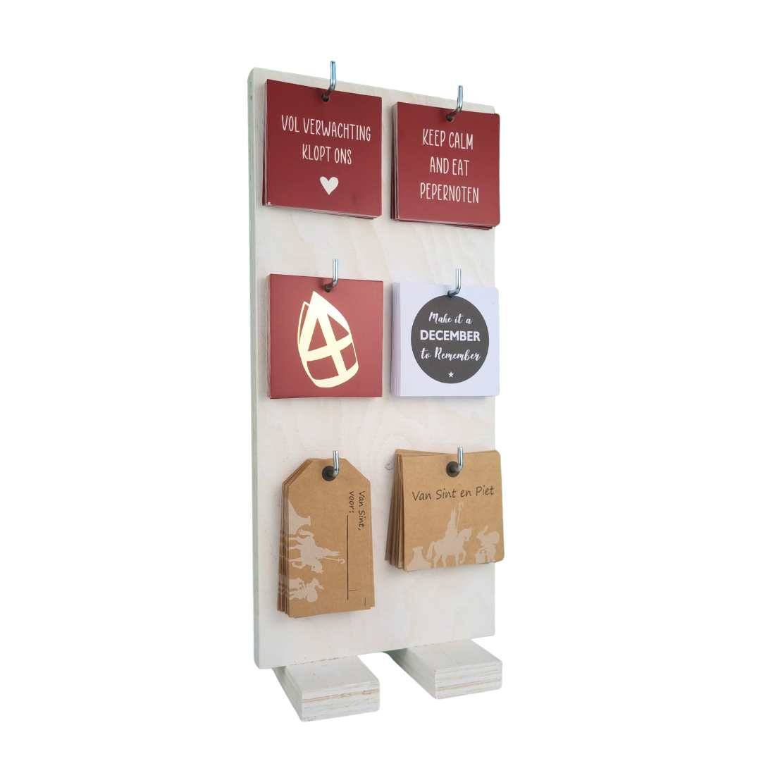 De stevige houten display presenteert de kaartjes overzichtelijk en maakt het makkelijk om snel het juiste kaartje te kiezen bij het inpakken. Ideaal voor winkels, scholen en bedrijven tijdens de sinterklaasperiode.