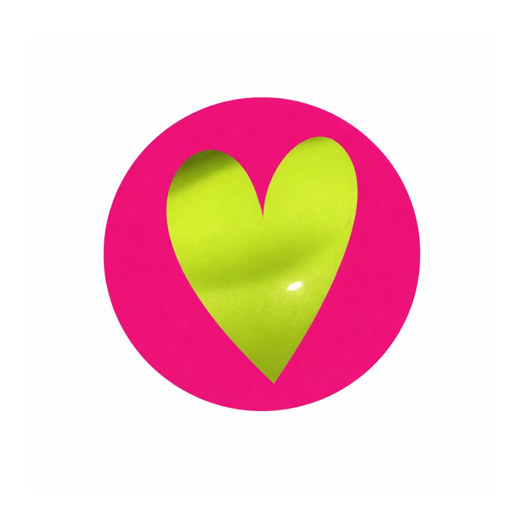 Deze etiketten – groen hart op roze zijn opvallende, zelfklevende stickers met een speelse en luxe uitstraling. De combinatie van een pink–magenta ondergrond met een metallic groene bedrukking in hartvorm zorgt voor een sterk visueel contrast en een feestelijk accent.