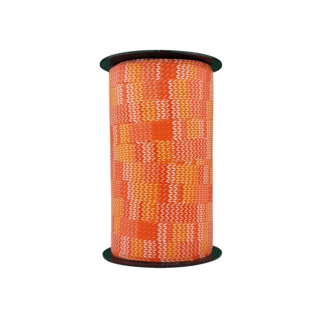Maak elk cadeau of feestdecoratie extra opvallend met dit levendige krullint van 10mm breed en 50 meter lang. Het lint heeft een energieke oranje kleur met een speels geel-wit zigzagpatroon, perfect om een vrolijke en feestelijke sfeer te creëren.