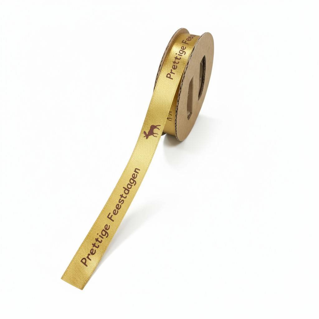 Dit luxe gouden satijnen lint met de tekst “Prettige Feestdagen” en een subtiel rendiermotief in donkerbruine bedrukking is de perfecte keuze voor stijlvolle en professionele feestverpakkingen. De hoogwaardige satijnkwaliteit zorgt voor een elegante glans, een zachte structuur en een uitstekende verwerkbaarheid. Dankzij de grote rol van 100 meter is dit lint uitermate geschikt voor intensief gebruik in winkels, bloemisterijen en cadeau-inpakservices.
