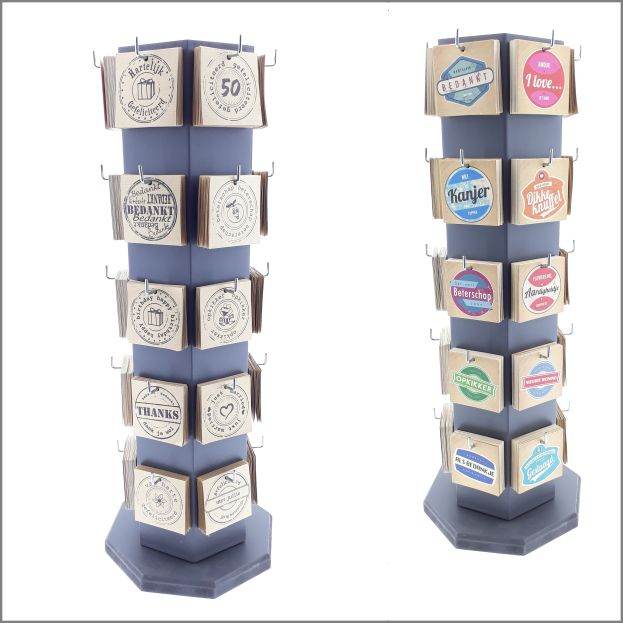 Display inclusief 1200 kado kaartjes. Prijs per kaartjes € 0.125 ct inkoop. Door zijn kleine draaicirkel pas deze display op iedere toonbank.