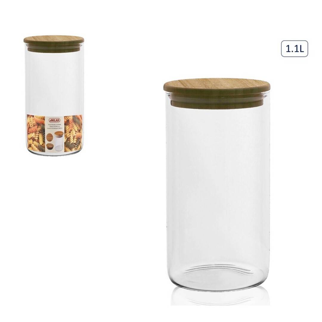 Houd je keuken netjes en georganiseerd met deze stijlvolle glazen voorraadpot van 1,1 liter. De pot is gemaakt van duurzaam, helder glas en heeft een natuurlijk ogend bamboe deksel met een siliconen afsluiting voor een luchtdichte opslag. Perfect voor het bewaren van bijvoorbeeld suiker, meel, granen, noten of snoep. Een elegante en praktische oplossing voor jouw voorraadkast of aanrecht.