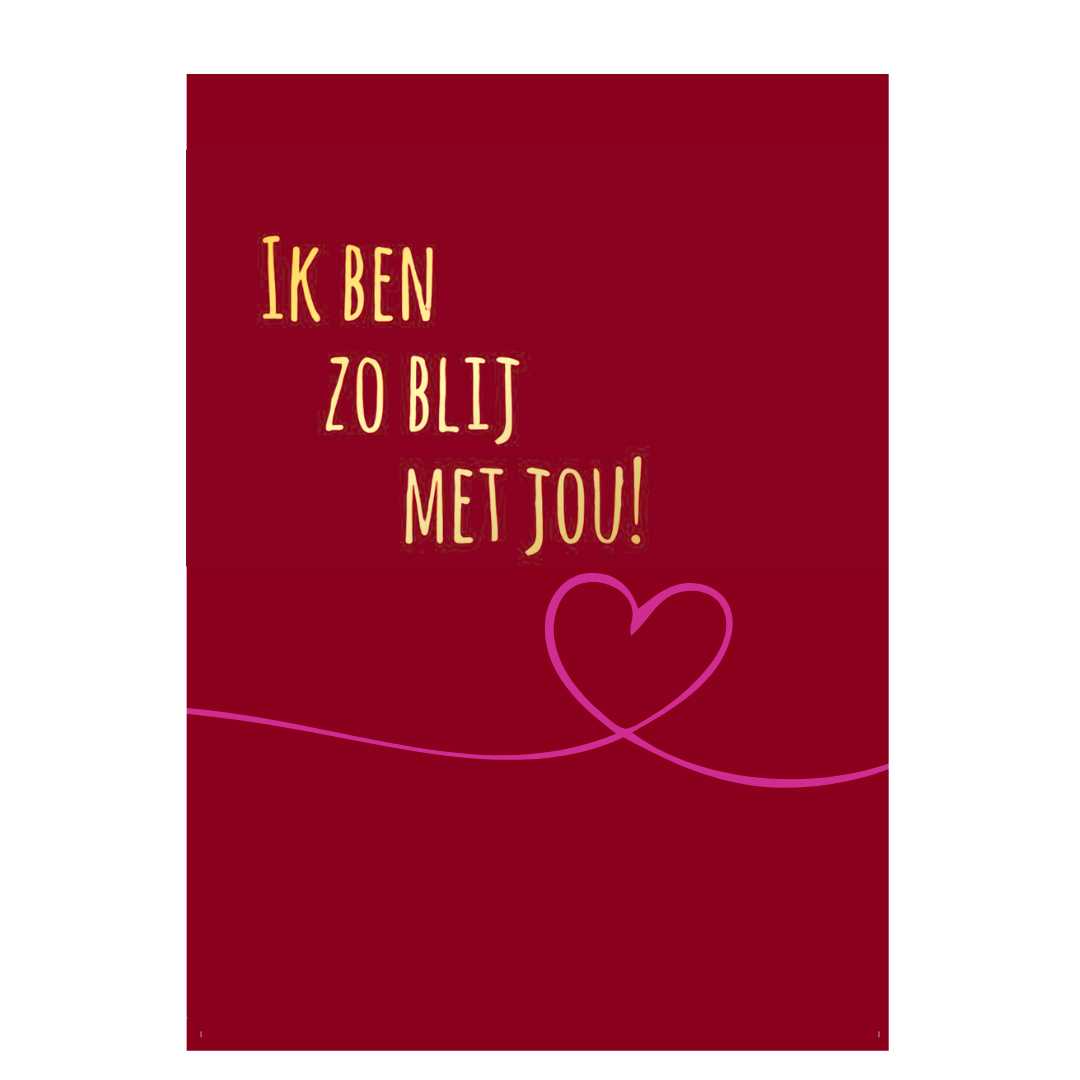 Deze set wenskaarten bestaat uit enkele kaarten met de tekst “Ik ben zo blij met jou!”. De kaart heeft een rode achtergrond met een hartillustratie en tekst in metallic goudopdruk.